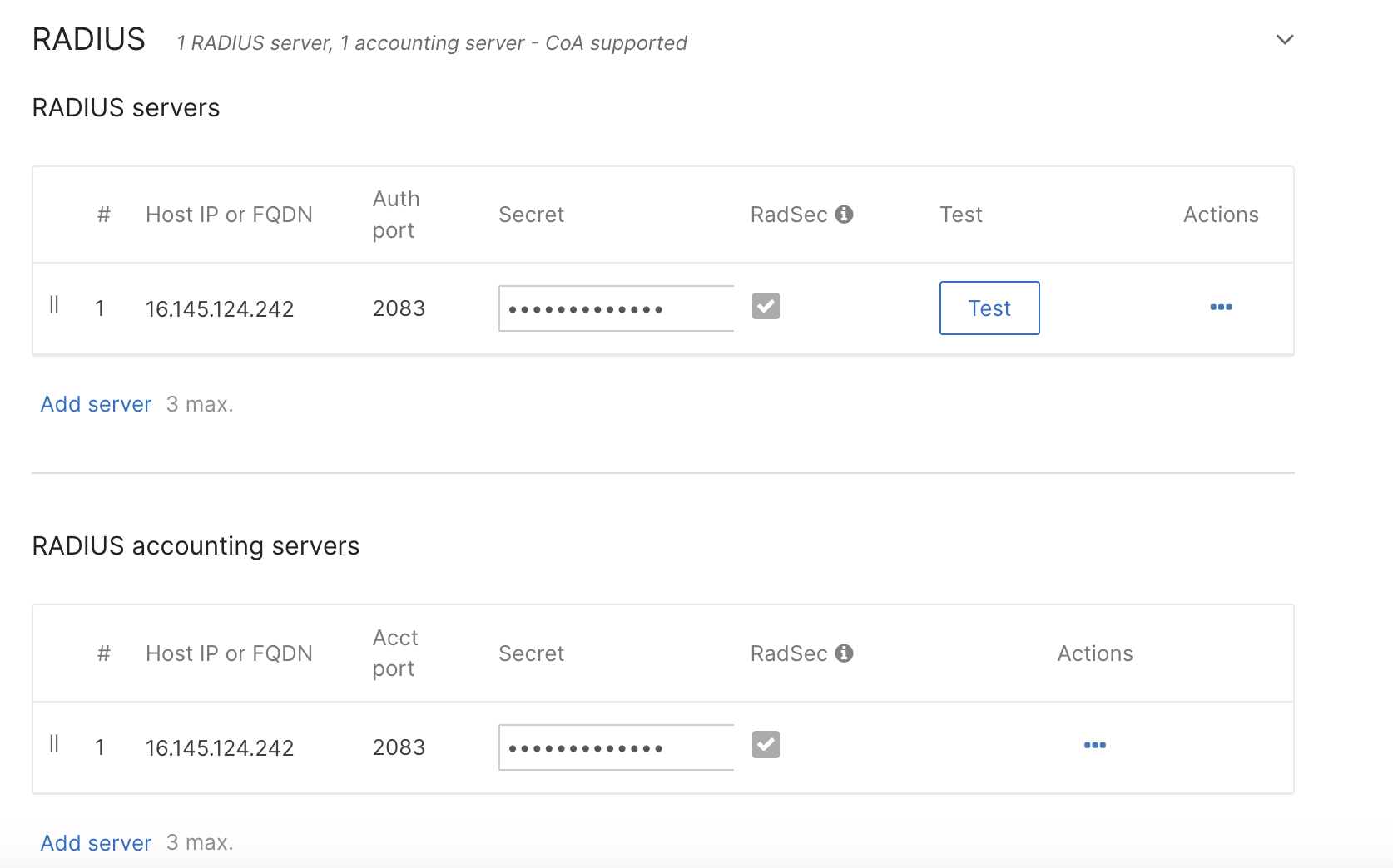 6. Repeat those steps to add the same server to the RADIUS Accounting Servers list using port 2083.