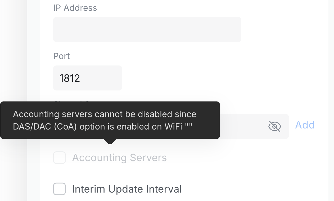 If the Accounting Servers checkbox is greyed out as in the image below, create the RADIUS profile with only the Authentication Servers, save, then reopen and edit the profile to add Accounting Servers. This is a current Ubiquiti UI bug.