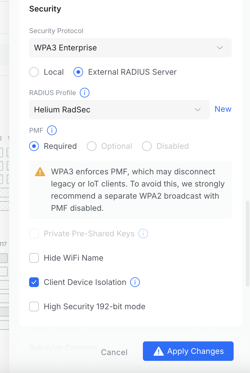 - Ensure Client Device Isolation is checked for secure networking. See the Ubiquiti guide on network and client isolation for more information.